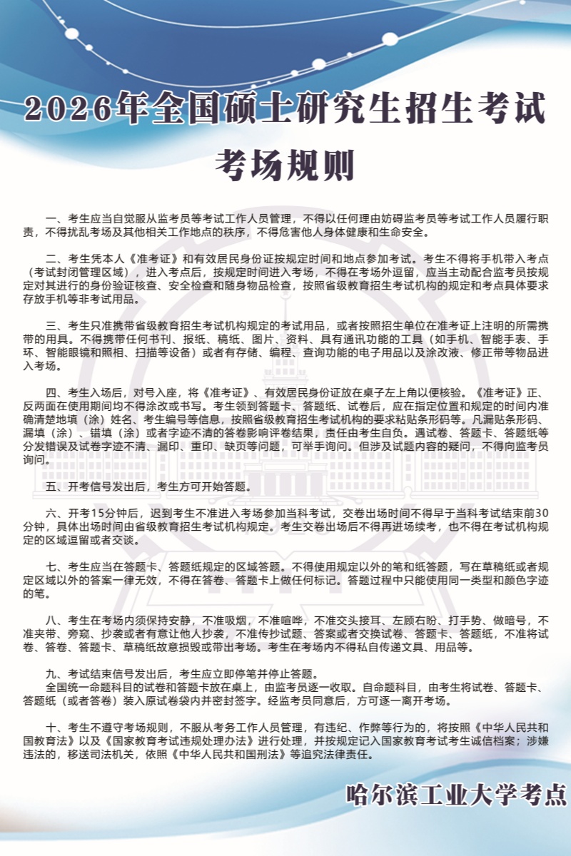 2026年硕士研究生招生考试(初试)将于12月20日、21日进行。为保证报考我校的各位考生考试顺利进行,现将有关事项提醒如下: