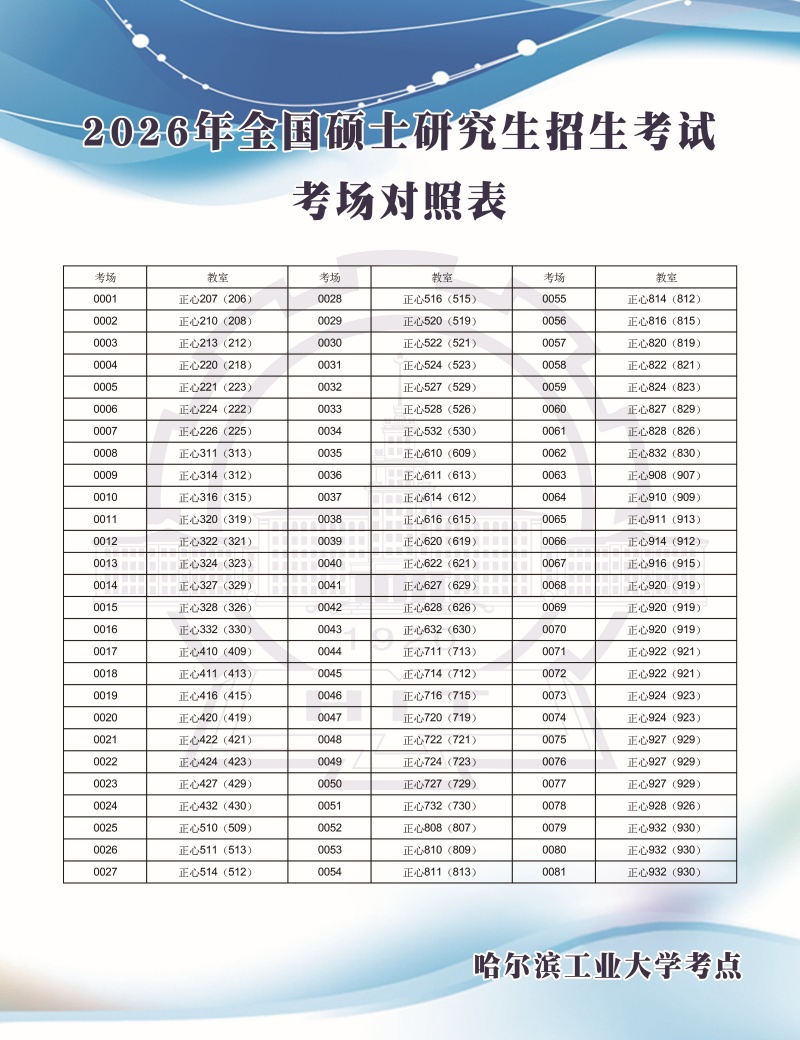 2026年硕士招生考试(初试)哈工大考点考场教室对照表